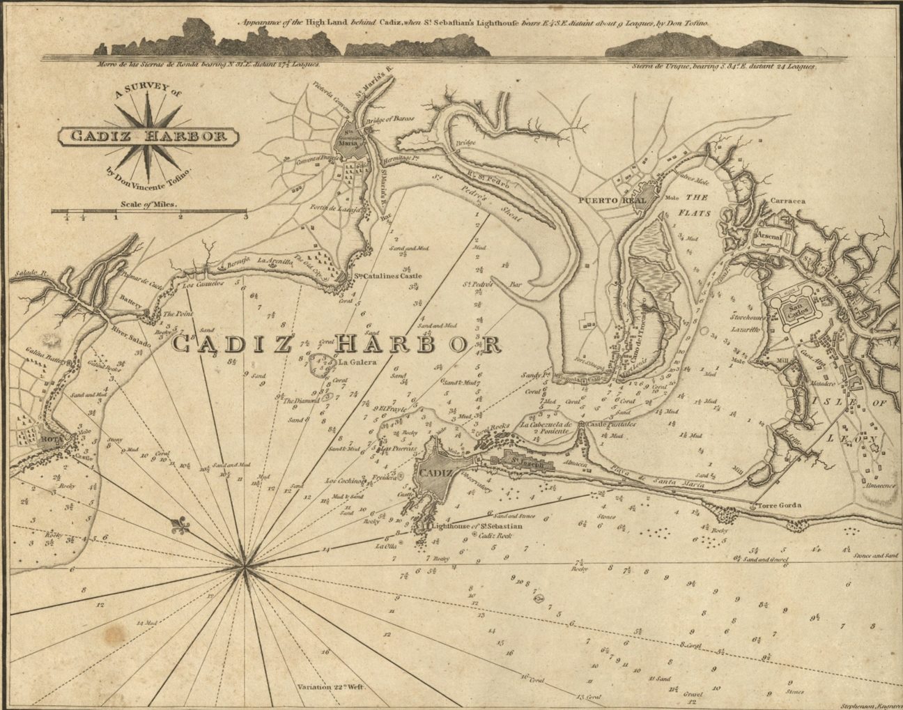 В условиях бушующего шторма, в кромешной темноте, добраться до якорной стоянки Кадиса было нелегко. Миновав скалы у Санкти-Петри, впереди у мореплавателей была относительно чистая вода почти до самого Кадиса. На карте Кадис выглядит как голова дракона. Длинный перешеек полуострова тянется на север к скалистому острову, на котором расположен город, а от него в сторону моря зияют две скалистые пасти, словно готовые поглотить неосторожного мореплавателя. На кончике более мощной нижней челюсти возвышается башня маяка Сан-Себастьян. Позади него форты Сан-Себастьян и Санта-Каталина охраняют вход в бухту, которая расположена севернее города. Идущим с юга кораблям приходится проходить мимо маяка, обходя его на достаточном расстоянии, потому что скалы простираются далеко за его пределы, затем следовать далее на север, подальше от рифа Бахо-лас-Пуэркас, первой из нескольких опасных скалистых отмелей у входа в залив. Самый безопасный глубоководный канал находится между скалами Диаманте и Галера дальше к северу. Все эти скалы «безобидно» скрываются под водой во время прилива, но во время отлива обнажаются их зазубренные грязно-коричневые очертания, окруженные белой пеной бурунов.
