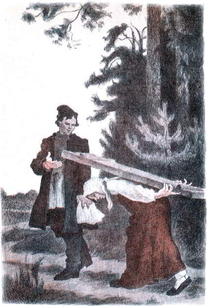 Брат на сосну лезет, и Дунюшка за ним с дверью мостится. Расположила дверь на сучьях и легла.