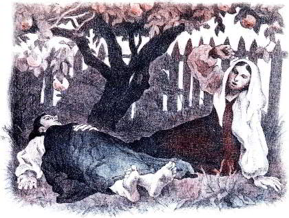 Надвинулась тёмная туча, молния ударила в яблоню. Загорела яблоня большим огнём. Жарко стало.