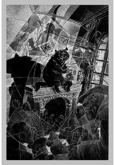 — Вызываю на дуэль! — проорал кот, пролетая над головами на качающейся люстре, и тут опять в лапах у него оказался браунинг, а примус он пристроил между ветвями люстры. Кот прицелился и, летая, как маятник, над головами пришедших, открыл по ним стрельбу. Грохот потряс квартиру. На пол посыпались хрустальные осколки из люстры, треснуло звездами зеркало на камине, полетела штукатурная пыль, запрыгали по полу отработанные гильзы, полопались стекла в окнах, из простреленного примуса начало брызгать бензином. Теперь уж не могло идти речи о том, чтобы взять кота живым, и пришедшие метко и бешено стреляли ему в ответ из маузеров в голову, в живот, в грудь и в спину. Стрельба вызвала панику на асфальте во дворе.