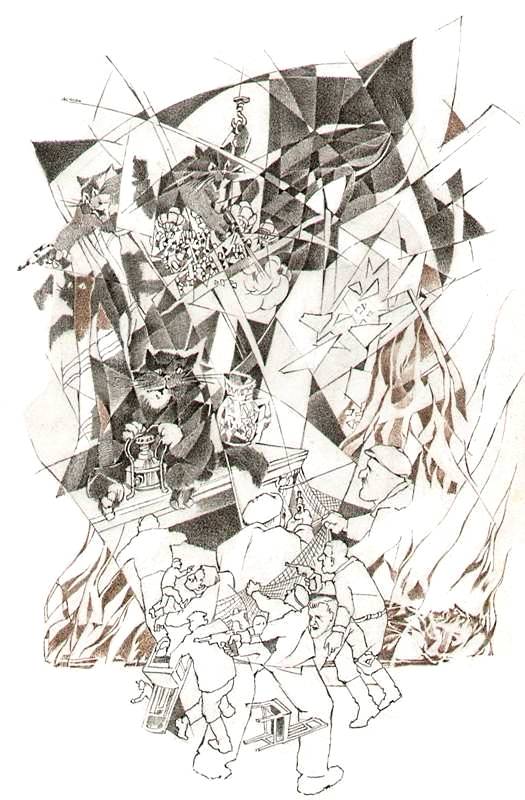 — Извините, не могу больше беседовать, — сказал кот с зеркала, — нам пора. — Он швырнул свой браунинг и выбил оба стекла в окне. Затем он плеснул вниз бензином, и этот бензин сам собою вспыхнул, выбросив волну пламени до самого потолка.