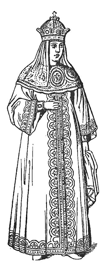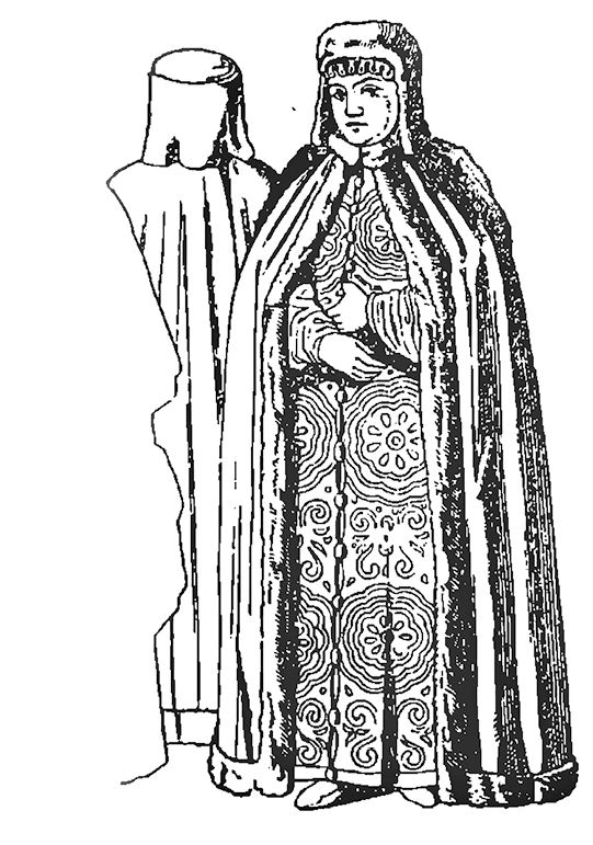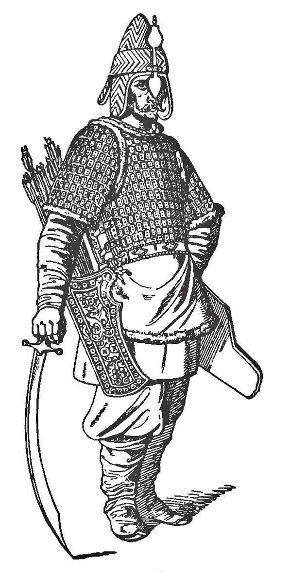 «Она состоит из довольно широких холщовых или сермяжных штанов, рубахи из того же материала, подпоясанной на бедрах, валяной шляпы или шапки с меховым околышем. Зимой накидывался овчинный тулуп и надевались сшитые из грубой ткани рукавицы. Ноги либо были босыми, либо обворачивались (включая нередко и голени) какой-нибудь тканью (портянками) с подвязанной подошвой Подошву выкраивали из невыделанной бычьей или свиной кожи или плели из лыка и для крепления к ноге к ней приделывали веревочки или ремешки. Иногда встречались и высокие сапоги с отворотами. Для одежды любили выбирать цветные ткани. Волосы обычно носили довольно короткие, ровно подстригая их на лбу… Бороду отращивали не все; по словам арабских авторов, одни из древних руссов брили себе бороду, а другие красили ее в желто-шафранный цвет».