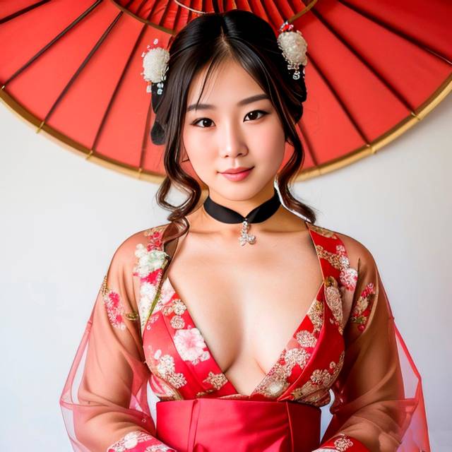 Традиционное красное кимоно идеально облегало её фигуру, с естественными складками на груди. Она надела модные белые босоножки, выставив на показ красивые пальчики.