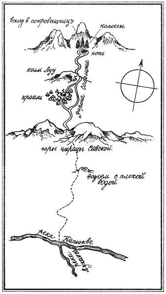 Подлинный кусок материи у меня дома, в Дурбане, вместе с переводом бедного дона Хозе, но у меня в записной книжке есть английский перевод и копия карты, если это вообще можно назвать картой. Вот она. А теперь слушайте: «Я, Хозе да Сильвестра, умирая от голода в маленькой пещере, где нет снега, на северном склоне вершины ближайшей к югу горы, одной из двух, которые я назвал Грудью Царицы Савской[26], пишу это собственной кровью в год 1590-й, обломком кости на клочке моей одежды. Если мой раб найдет эту записку, когда он придет сюда, и принесет ее в Делагоа, пусть мой друг (имя неразборчиво) даст знать королю о том, что здесь написано, чтобы он мог послать сюда армию. Если она преодолеет пустыню и горы и сможет победить отважных кукуанов и их дьявольское колдовство, для чего следует взять с собой много священнослужителей, то он станет богатейшим королем со времен Соломона. Я видел собственными глазами несметное число алмазов в сокровищнице Соломона, за Белой Смертью, но из-за вероломства Гагулы, охотницы за колдунами, я ничего не смог унести и едва спас свою жизнь. Пусть тот, кто пойдет туда, следует по пути, указанному на карте, и восходит по снегам, лежащим на левой Груди Царицы Савской, пока не дойдет до самой ее вершины. На северном ее склоне начинается Великая Дорога, проложенная Соломоном, откуда три дня пути до королевских владений. Пусть он убьет Гагулу. Молитесь о моей душе. Прощайте. Хозе да Сильвестра».