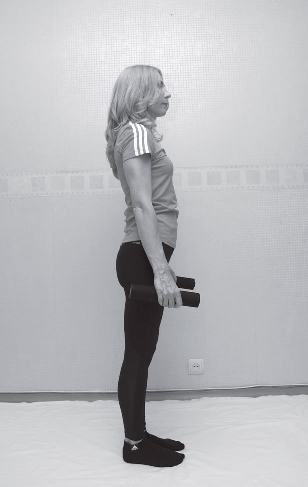 ИСХОДНОЕ ПОЛОЖЕНИЕ: стоя. Руки согнуты в локтях, гантели около плеч.