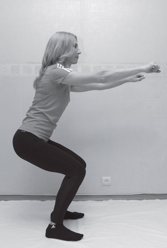 Быстро присядьте, но не глубоко, а примерно до угла в 90 градусов (не ниже).