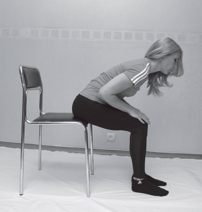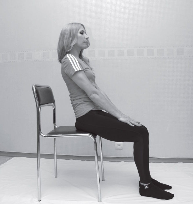 ИСХОДНОЕ ПОЛОЖЕНИЕ: сидя на краю стула. Ноги согнуты под углом чуть больше, чем 90 градусов. Руки лежат на коленях.
