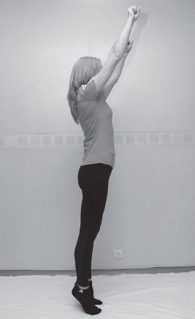 Быстро приподнимитесь на цыпочках, и одновременно сделайте мах руками вперед и вверх — то есть поднимите руки над головой.