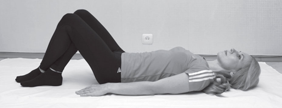 ИСХОДНОЕ ПОЛОЖЕНИЕ: лежа на спине, ноги согнуты в коленях, стопы плотно прижаты к полу, руки вытянуты вдоль тела.