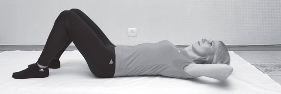 ИСХОДНОЕ ПОЛОЖЕНИЕ: лежа на спине, ноги согнуты в коленях, стопы на полу. Руки сцеплены на затылке, локти разведены в стороны.