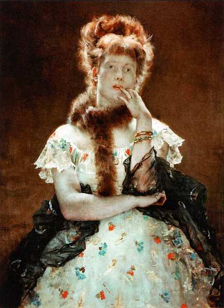 На картине «Парижский сфинкс» перед зрителем представлена прекрасная молодая женщина с рыжеватыми волосами, погрузившаяся в раздумья и приложившая изящный пальчик к полураскрытому рту. Какая мысль или догадка поразила юную парижанку в легком, воздушном платье, что заставило ее застыть в нерешительности, прервав свой путь? Подобно сфинксу из древнегреческого мифа об Эдипе, эта девушка, кажется, окутана тайными мыслями и намерениями, разгадать которые — удел избранных героев. Тема роковых, загадочных красавиц, сводящих с ума поклонников, разрушающих мирное существование мужчин, очень интересовала общество, что находило отражение в салонной живописи второй половины XIX века.
