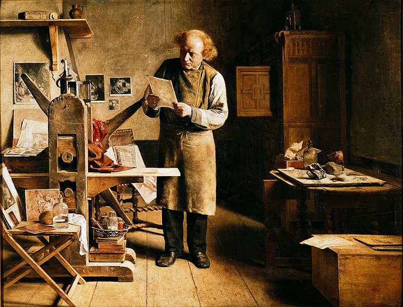 Представленная картина пленяет гармоничностью и спокойствием. Обширная мастерская, наполненная печатными принадлежностями, через широкое окно озаряется светом, мягко обволакивающим фигуру пожилого ремесленника, рассматривающего новый оттиск и проверяющего его качество. Печатник существует в особом вневременном пространстве, его станок почти не изменился за прошедшие столетия. Гравюра, исполненная на бумаге, начиная с XV века по-прежнему продолжала играть важную роль в искусстве XIX века. Оттиски, создаваемые с помощью станка, были доступны значительно большему числу людей, чем живописные произведения. Воспроизводя знаменитые полотна художников, гравюра способствовала распространению образования и культуры среди всех слоев населения. Искусство гравера — тщательная и тонкая работа, требующая выучки и аккуратности, но и это кажущееся вечным производство вскоре почти исчезнет, уступив место современным типографиям, оборудованным в соответствии с научно-техническим прогрессом.