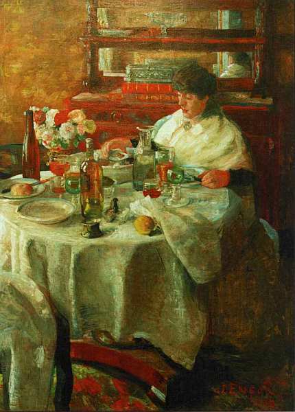 «Завтрак с устрицами» — одна из ранних значительных работ Джеймса Энсора, представленная в коллекции Королевского музея. На ней изображена залитая солнцем столовая, в центре которой накрытый на две персоны стол, уставленный стеклянными бокалами и фужерами, молодая женщина за ним собирается отведать устриц. Этой картиной молодой художник продолжил серию под названием «Буржуазный салон», демонстрирующую сцены из жизни обеспеченных людей маленького городка. Работа указывает на внимательное изучение открытий французских импрессионистов и сильное увлечение ими, для передачи иллюзии солнечного света живописец использует яркие цвета — красные, желтые, оранжевые и их оттенки. Палитра мастера этого периода высветляется, воздух как бы вибрирует благодаря раздельно положенным мазкам.