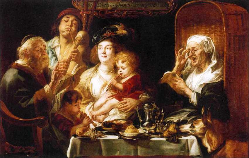 «Семейный концерт», вероятно, самая популярная в Бельгии картина фламандца Якоба Йорданса. В верхней части работы начертана фламандская пословица: «Как поют старики, так свистят молодые». У накрытого стола расположилась семья, отмечая по традиции праздник Трех волхвов. Трапеза начинается пением стариков, им аккомпанируют представители младших поколений. Юмористический настрой не покидает художника, который, тем не менее, искренне чтит семейные праздники и собрания. Образы поющих пожилых людей выразительны, правдивы и немного комичны. Словно слышится тонкий дребезжащий голосок робкого доброго старика и более резкий, уверенный голос его бойкой супруги. Считается, что мужчина похож на Адама ван Ноорта, отца и учителя живописца. Он держит волынку под мышкой и увлеченно играет на инструменте. Даже собака навострила уши и пытается понять происходящее музыкальное действо. Старший отпрыск играет на флейте, в центре за столом сидит молодая женщина с ребенком на руках — это дочь Иорданса Елизавета, сияющая красотой и жизнерадостностью.