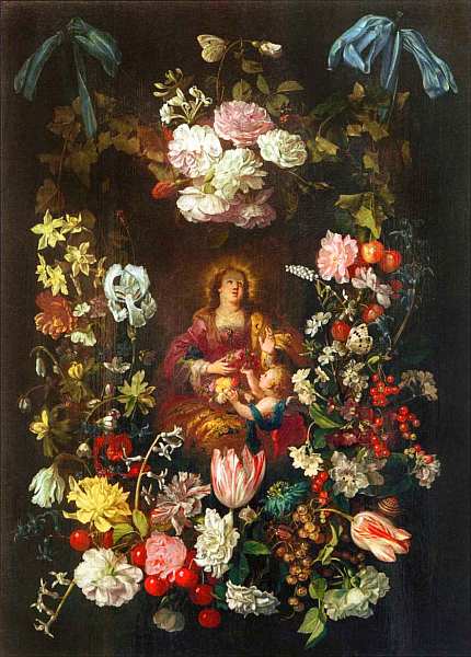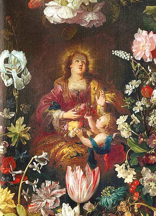Данная картина — так называемая обманка — одна из нескольких точно приписываемых художнику работ. На темном фоне он изобразил прекрасную гирлянду, которая подвешена на двух голубых лентах, завязанных в банты. Изумительно по пышности и роскоши обрамление из живых цветов, бабочек и жуков, вишен и веточек смородины, великолепны бело-розовые пионы, нарциссы и тюльпаны — ликующие спутники зрелой весны. Центральное место внутри венка занимает святая Доротея — покровительница садоводов и невест, ей ангелочек вручает венок из роз и корзину с цветами и тремя яблоками — традиционным атрибутом христианской великомученицы. Вокруг головы героини сверкает нимб, ее взгляд обращен на небо. Подобные картины были популярны во Фландрии XVII века, похожие произведения создавали также Ян Брейгель и Дэниел Зегерс.