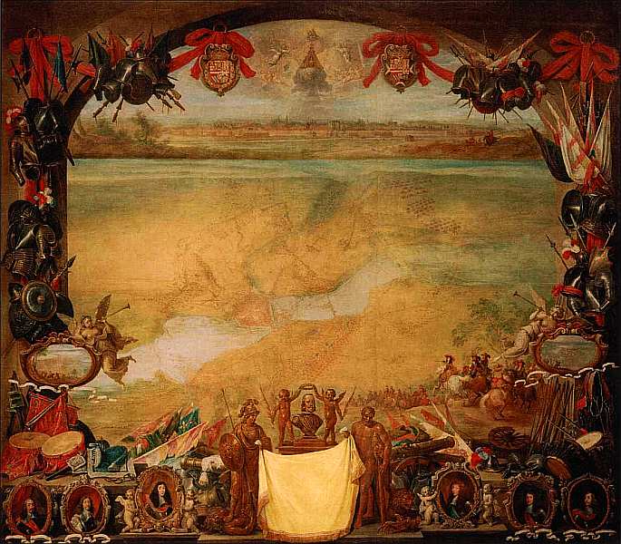 Полотно «Город Валансьен» было написано в честь его освобождения от французов. Испанцы во главе с Доном Хуаном Австрийским и принцем Людовиком де Конде встретились с армией прославленного полководца Анри де Ла Тур д'Овернь, виконта де Тюренна. Французы потерпели сокрушительное поражение, которое едва не поставило крест на удачной военной карьере маршала. Произведение Тенирса больше напоминает карту, чем пейзажное изображение, слева и справа от плана города показаны расположения воюющих сторон, а также оружие Испании и аллегорические фигуры, олицетворяющие Валансьен. В центре бюст Филиппа IV венчают лавровым венком два амура, их окружают Афина, попирающая ногами Медузу горгону, и Геркулес, рядом с которым лев вцепился в петуха — негласный символ Франции. В картушах представлены портреты Дона Хуана Австрийского, принца де Конде и других командиров армии. Как показала история, это была последняя великая победа Испании в XVII веке.