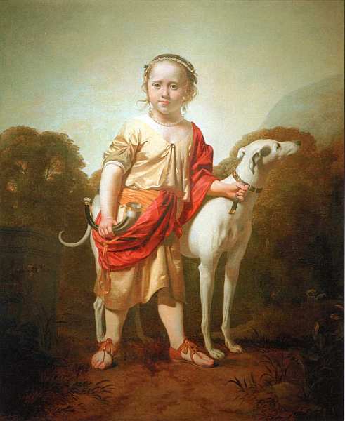 В любом случае полотно обладает всеми характеристиками, отличающими классицистический стиль. Ему свойственны ясность и светоностность, представительность, внимание к исполнению деталей и исторические или мифологические отсылки. Маленькая светловолосая девочка, типичная голландка, представлена на живописной полянке в чаще леса. Она одета в желтое фантазийное платье, доходящее до колена, на него накинут замысловато завязанный плащ красного цвета. Ноги ребенка обуты в сандалии, напоминающие древнегреческие, и перевиты желтыми лентами, завязанными бантами. Мастер проводит явные параллели с античной богиней охоты Дианой, чьи атрибуты — рожок и белая гончая, которую придерживает юная особа. На высокий социальный статус изображенной весьма красноречиво указывают жемчужные серьги и ожерелье, этими же морскими драгоценностями украшена повязка на голове, а одна маленькая жемчужинка прикреплена на платье в зоне декольте.