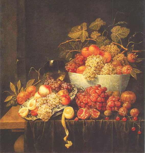 «Натюрморт с виноградом» представляет квинтэссенцию «фруктовых натюрмортов». Сочные и спелые фрукты, только что вымытые и аккуратно разложенные на столе, выписаны мастером так живо и натуралистично, что возникает желание протянуть руку и отломить веточку зеленого винограда, съесть мягкий персик. Утрехт прославляет природу и ее плоды, он восхищается роскошью и изяществом натуральных форм. Все в картине говорит об изобилии и достатке. Темно-зеленая бархатная ткань подчеркивает яркую красочность осеннего натюрморта. Интересная особенность — фрукты уложены на столе параллельно картинной плоскости. Полотно, вероятно, было заказано зажиточным бюргером для украшения интерьера своего дома.