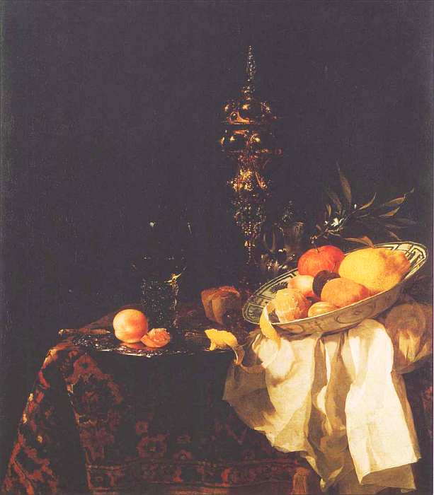 «Десерт» голландского художника Виллема Калфа — прекрасный пример богатого, нарядного и красочного натюрморта, в котором отобразилось стремление разбогатевшего бюргерского класса к роскоши и помпезности. В картине чувствуется незримое присутствие человека — хозяина изображенных вещей. Композиция «Десерта» достаточно традиционна: на столе стоят два бокала, небольшой кувшин и фаянсовая тарелка со свежими фруктами. Стол застелен дорогим бархатным ковром, золоченый кубок на нем — тонко проработанное произведение ювелирного искусства. Калф мастерски передает тонкость стекла бокала и блики на серебряной тарелке. С любовью написаны фрукты, выделена фактура глянцевой неровной корочки разрезанного лимона, его сочная мякоть. Яркие цвета и оттенки фруктов придают полотну красочное звучание, обособляя его среди других произведений. Калф благодаря своим уникальным изобразительным способностям значительно расширил иллюзионные возможности натюрмортной живописи и отобразил вкусы аристократии второй половины XVII века.