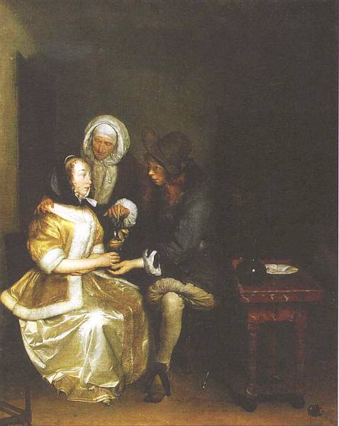 Вероятно, «Бокал лимонада» — это самая знаменитая картина крупнейшего мастера голландской жанровой живописи Герарда Терборха. Произведения художников были небольшого размера и предназначались для украшения квартир обеспеченных горожан. Бытовой сюжет полотна, которое можно назвать «сценой у сводни», имеет прямое отношение к действительности, но разыгран весьма деликатно и тонко, без акцента на интимной теме. Нарядная девушка и молодой человек занимаются приготовлением лимонада; девушка держит в руке бокал, в то время как юноша, придерживая его одной рукой, размешивает содержимое другой. Однако приготовление напитка — лишь повод для их близости, что подтверждается красноречивым взглядом юноши и легким смущением молодой особы. Третье лицо — старуха, склонившаяся над героиней, — как бы молчаливо советует ей решиться на что-то определенное. Терборху удавалось мастерски выписывать переливы шелка и атласа, золотое шитье в отделке платьев, что способствовало его популярности у зажиточных бюргеров.