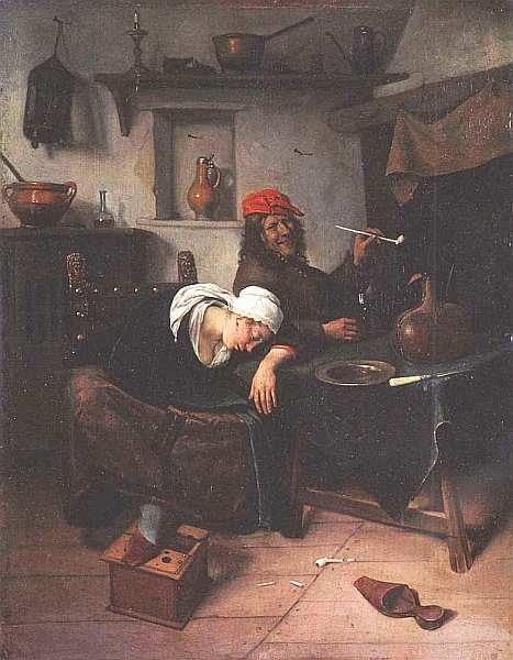 Ян Стен — один из ярких мастеров голландской бытовой живописи XVII века. Тема веселья, развлечений и веселых пирушек Стену, владельцу кабачка, была знакома, как никому другому. Художник в своих картинах не стремится к психологическому анализу героев. Он изображает только то, что может увидеть любой зашедший в трактир, где была веселая пирушка. В образе улыбчивого добродушного гуляки Стен изобразил себя. Он как бы приглашает зрителя снисходительно посмеяться над ним и его женой Маргарет, которая сладко спит, не имея сил переменить неудобное положение. Повсюду господствует беспорядок, придающий дополнительный комизм ситуации: на полу валяются черепки разбитой трубки, на переднем плане — большая туфля, слетевшая с ноги хозяйки. Вся сцена до мельчайших деталей показана с большой теплотой и юмором.