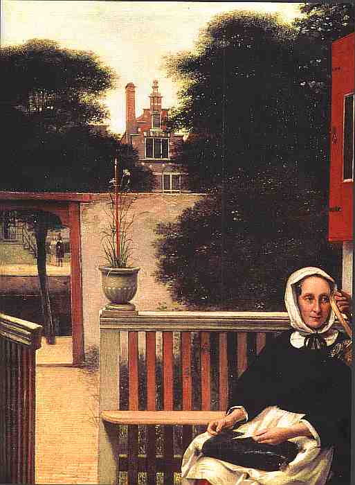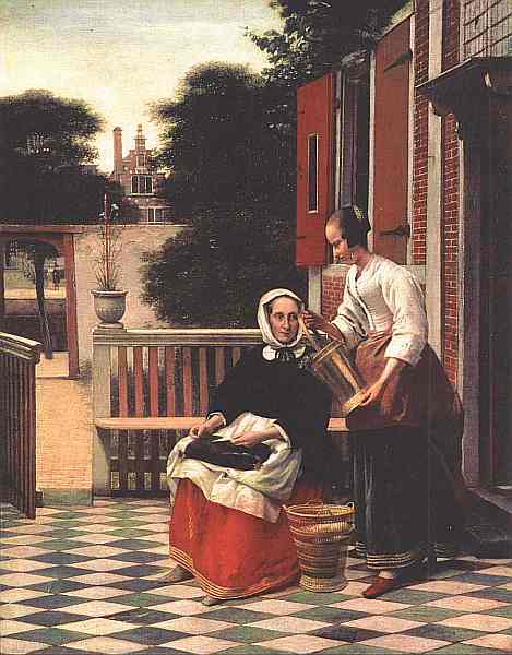 Питер де Хох — один из ярких представителей делфтской школы живописи, традиционной темой изображения которой был интерьер. «Хозяйка и служанка» — образец голландского жанра, в котором сконцентрированы все достоинства делфтской школы. Де Хох с особой любовью выписал все детали интерьера: каждый кирпичик, аккуратную кладку плитки пола, деревянную балюстраду и вазон с гвоздикой. Картина восхваляет спокойную жизнь в тихом, немного замкнутом мирке крепкого и аккуратного дома. Хозяйка находится тут же, она в скромном костюме, на ее трудолюбие намекает рукоделие, лежащее на коленях. Хох находил и подчеркивал красоту в обыденных предметах — начищенном до блеска ведерке в руках служанки, прозрачной, почти кружевной плетеной корзине, буквально горящей на свету. Персонажи полотна естественно и уютно чувствуют себя в среде голландских обывателей, они существуют в атмосфере тихой гармонии.