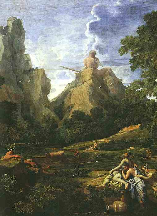 Природа у Пуссена — мир идеальной красоты, в отличие от работ многих современников произведения живописца наполнены глубоким философским содержанием. В представленном полотне заключена идея величия и мощи природы, ее связи с человеком. Герои произведения заимствованы из «Метаморфоз» Овидия. В центре картины на заднем плане сидит почти слившийся с горой циклоп Полифем. Полюбивший нимфу Галатею и тоскующий по ней, он вкладывает свое неразделенное чувство в песни, наигрываемые на свирели. Постепенно из пугающего всех чудовища Полифем превращается в любимца нимф, которые приходят послушать музыку. Кажется, что сама природа застыла и внимает нежным мелодиям гиганта. Яркий просвет справа открывает перспективу на далекое море и как бы освещает всю величественную картину земного мироздания.