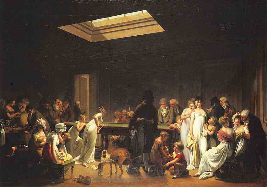 После революции появилось множество кафе, недорогих ресторанчиков, где люди могли встретиться, завести новые знакомства, поговорить, обсудить последние новости. К числу таких заведений относились и бильярдные — просторные залы, в которых, выпив чашку чая и пообщавшись с друзьями, можно было развлечься ставшей чрезвычайно популярной после 1789 игрой. В зале, освещенном верхним светом, дающим художнику возможность сделать ряд акцентов, изображено весьма пестрое общество. Главные действующие лица — игроки и бильярд.