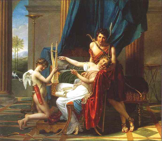 Картина от сюжета до одежд героев и мебели, которую живописец специально изучал по памятникам античного искусства, выдержана в духе классических образцов. Композиция полотна довольно статична и театральна, фигуры персонажей напоминают ожившие идеальные статуи. Мифологический элемент в произведении — Купидон, причем совсем не маленький пухлый мальчик, обычный для произведений барокко и рококо. Здесь в его фигуре явно читаются классицистические пропорции удлиненного тела. Крылатый бог любви протягивает Сафо лиру — символ поэтов, как бы намекая, что благодаря этому чувству создаются лучшие произведения.