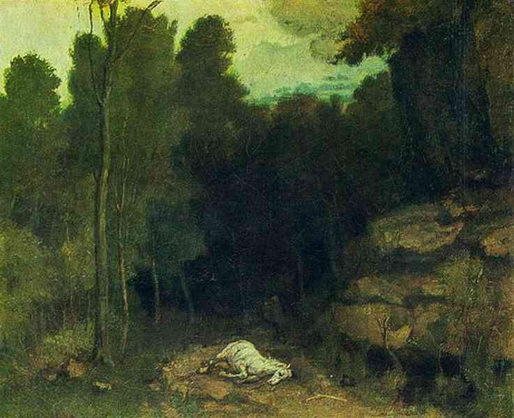 Сюжет картины загадочен: в центре композиции на обочине дороги посреди чащи лежит туша мертвой белой лошади. Едва различима фигура человека, который убегает в глубь леса. Для зрителя случившееся остается тайной: было ли животное убито или человек здесь ни при чем, а просто является свидетелем несчастного случая? Современники отмечали смелость, с которой Курбе показал лошадь, совершенно не страшась шокировать публику. Мастер твердо решил отображать правду жизни, какой бы неприглядной она ни была.