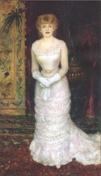 Крупнейший представитель французского импрессионизма, Пьер Огюст Ренуар очень много работал в области портрета. Его женские образы полны очарования и непосредственности. Блестящим примером является портрет актрисы театра «Комеди Франсез» Жанны Самари. Она изображена во весь рост на фоне японской ширмы, ковра и пальмы, специально принесенных художником в обычно пустую мастерскую для создания парадной обстановки. Ренуар едва наметил психологический рисунок своей модели, он с радостью перешел к передаче перламутровости ее кожи, пушистости легких рыжеватых волос, подведенных глаз и ярких приоткрытых губ. Как истинный импрессионист, Ренуар с удовольствием разбирает сложную цветовую гамму светлого платья актрисы, создает разнообразные по форме мазки золотистого, розоватого и сиреневатых тонов.