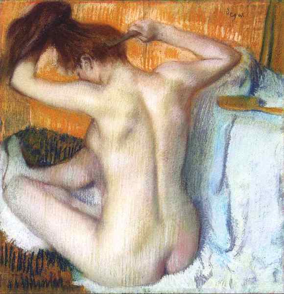 В Эрмитаже хранится одна из лучших «пастельных» работ мастера — «Причесывающаяся женщина» или «Женщина за туалетом». Молодая девушка, сидящая в сложной позе, изображена со спины. Тонкая моделировка тела, плавная, текучая линия силуэта и чистый светлый колорит картины пленяют зрителя. Дега использовал тончайшие нюансы однотонной, гладко растушеванной пастели, потом постепенно обогащал их другими оттенками и переходами, а под конец вводил яркие цветовые штрихи, подчеркивающие ту или иную форму.