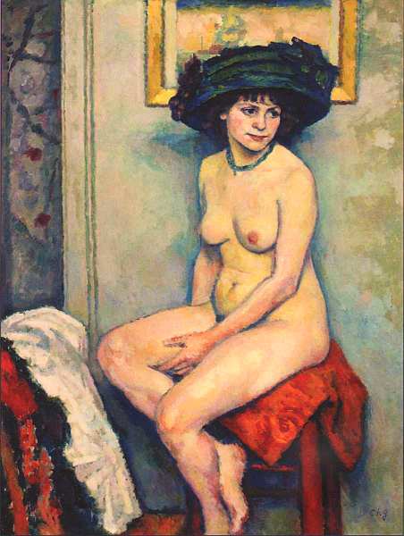 Обнаженная модель на представленной картине спокойно позирует художнику, совершенно не смущаясь обстановки и полного отсутствия одежды, кроме большой черной шляпы. Контурная линия синего цвета подчеркивает и выделяет бело-розовую кожу натурщицы. В этой работе Герена чувствуется влияние декоративных работ Мориса Дени, а цветовой строй полотна напоминает произведения Поля Сезанна с его изысканной сине-голубой тональностью. Известный любитель искусства С. И. Щукин неоднократно приобретал картины Герена в свое собрание.