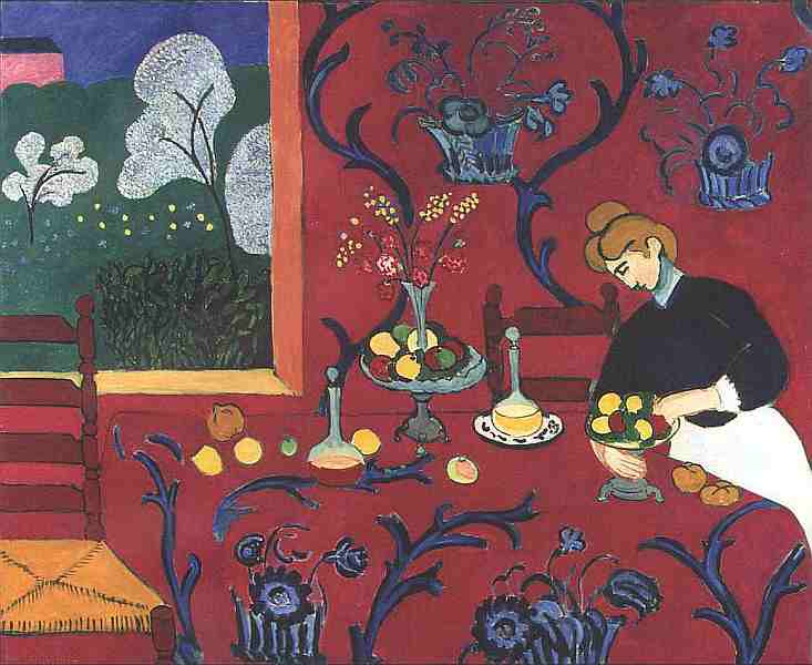 Монументальную композицию «Красная комната» мастер называл «декоративным панно». Оно было заказано для столовой московского особняка известного русского коллекционера и мецената Сергея Ивановича Щукина. Художник начинал писать полотно как «Гармонию в голубом», взяв за образец декоративную ткань с голубыми узорами. Однако накануне осеннего Салона 1908 в Париже Матисс неожиданно кардинально переписал его, объяснив это тем, что оно показалось ему недостаточно декоративным и в красном цвете все выглядит значительно красивее.