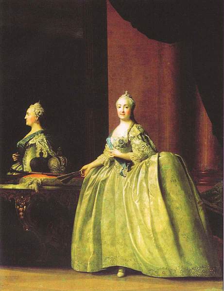 Портрет Екатерины II необычен по своей композиции. Благодаря зеркалу императрица показана дважды: в трехчетвертном повороте и в профиль. Эриксен прекрасно обыграл натуру модели. С одной стороны она показана как императрица, чей гордый профиль отражается в зеркале, с другой — она предстает красивой молодой женщиной в изысканном платье со знаками ордена Святого Андрея Первозванного. В руке Екатерины — веер, а не скипетр, хотя им она указывает на царские регалии. Императрица как бы намекает, что нельзя быть правительницей и забыть при этом о своем женском начале.