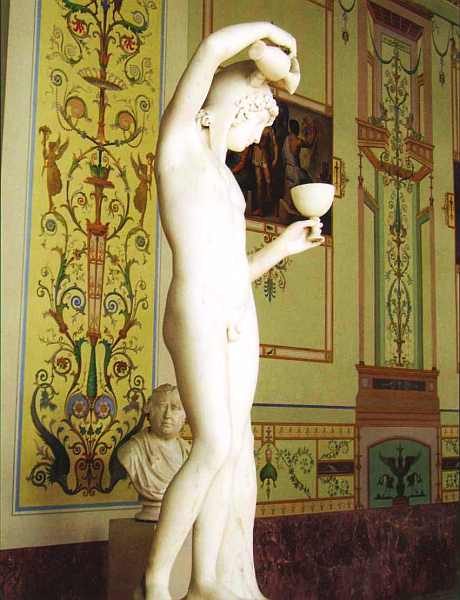 Представленная статуя как раз изображает момент, когда Ганимед из амфоры наполняет сосуд для кого-то из сонма богов. Его фигура отличается классической завершенностью и грациозностью, которые ей придают несколько вытянутые пропорции юношеского тела. Статуя выделяется холодной отвлеченностью и бесстрастной идеализацией образа, подчеркнутой виртуозной обработкой мрамора.