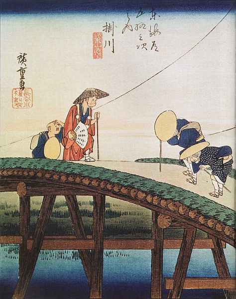 В ксилографии на первый план выдвигается мост с идущими по нему людьми, пейзаж с горой отодвинут вправо, кажется, что он мало занимает художника. Композиция построена так, что создается эффект присутствия: зритель словно входит в пейзаж, нижняя кромка листа становится точкой, с которой он рассматривает происходящее. С помощью противопоставления планов передается и глубина пространства. В основе работы лежит актуальная для японского искусства идея пути и перемещения в пространстве. В картушах начертаны название серии, краткое описание и подпись Хиросигэ.