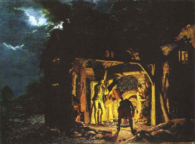 Английский живописец Джозеф Райт прожил почти всю жизнь в Дерби, вдали от лондонской суеты. В своих полотнах он передал атмосферу индустриальной Англии, ее технический прогресс и научные открытия эпохи. Художник любил изображать ночные пейзажи, освещенные луной, нередко включая их в композиции в качестве фона. Он как бы ставил эксперименты, играя с эффектами различного освещения. В картине «Кузница. Вид снаружи» Райт прекрасно справляется с трудной задачей совмещения в одной жанровой сцене освещения от естественного и искусственного источников. Это рождает характерное для произведений Райта тревожно-таинственное настроение. В холодную лунную ночь мягкий свет пламени горна кузницы озаряет окружающую темноту, притягивая людей.
