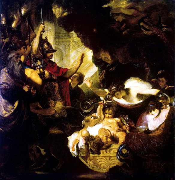 В 1785 Екатерина II сделала Рейнолдсу заказ на картину, предоставив выбор сюжета ему самому. Мастер, решивший прославить победы России, избрал историю Геракла, как бы намекая на силу и мощь молодой Российской империи. Еще в младенчестве, лежа в колыбели, Геракл уже показал свой героический нрав и божественное происхождение: ревнивая жена Зевса, богиня Гера, решила избавиться от мальчика и натравила на него двух змей. Когда змеи обвили тело младенца, Геракл схватил их за горло и тотчас задушил. В позах и жестах персонажей много театрального, характерного для английской академической школы живописи второй половины XVIII века. Закрученная композиция, бурное движение и красно-коричневая гамма усиливают накал страстей.