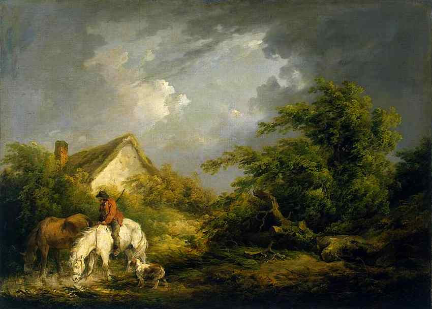 Выдающийся английский пейзажист, анималист и мастер жанровых сцен конца XVIII века, Джордж Морленд был известен как певец сельской местности укромных уголков Англии. С юных лет художник уезжал из города писать деревенскую природу и поселян. На небольших холстах, реже — деревянных досках он изображал темные леса и освещенные солнечным светом поляны, серебристые ручьи с переброшенными через них мостиками, хижины и деревенские трактиры, крестьян, живущих в гармонии с природой. «Приближение грозы» принадлежит к числу редких для Морленда больших и тщательно проработанных полотен. Удачна композиция картины: спокойная группа переднего плана противопоставлена взволнованной природе, еще немного — и из темных туч хлынет дождь! Этот контраст Морленд подчеркивает и живописными приемами: широкие удары кисти создают небо, застланное облаками; дробные, мелкие мазки динамично передают трепещущую листву и бегущие по небу облака. Ветер сгибает ветви деревьев, пробегает волной по траве, треплет гривы лошадей; набежавшая туча мгновенно меняет освещение: остается последний луч солнца.