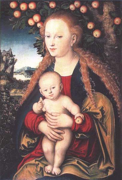 Кранах изобразил рыжеволосую Мадонну в образе прекрасной молодой женщины, напоминающей принцессу из немецких сказок. Она находится в яблоневом саду на фоне пейзажа с видом Саксонии — замком и горами. Одежда Мадонны соответствует одежде немецких аристократок. Цветовая гамма картины разнообразна и насыщена благородным красным, желтым, золотистым, зеленым и их оттенками. Мадонна и Младенец Иисус, с деликатно подчеркнутыми пропорциями детского тельца, внимательно смотрят на зрителя, словно давая понять, что им уже известна уготованная судьба и они готовы принять ее без тени сомнения. Взгляд удлиненных глаз Богоматери печален и задумчив — она знает, что должна потерять сына. Прямым намеком на это служат яблоко и хлеб в руках Младенца, символы искупления греха.