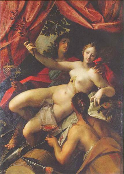 Ханс Аахен — представитель немецкого маньеризма в живописи, прославившийся своими аллегориями и картинами на мифологические и религиозные сюжеты. На крупноформатном полотне изображено торжественное празднество по случаю единения Мира, Искусства и Изобилия. Мир — обнаженная девушка в центре композиции, чье тело изображено по канонам маньеризма. У нее в руках — оливковая ветвь — символ мира. Персонифицированное Искусство обнимает Мир за плечо. Спиной к зрителю представлено Изобилие, которое протягивает Миру кубок с вином. Военная атрибутика попрана: барабаны, копья и латы лишние на этом празднике. Художник не зря поместил Мир в центр, ведь от него зависит благополучие искусства. Композиция не лишена театральности, которую подчеркивает красная материя-кулиса, обрамляющая действо.