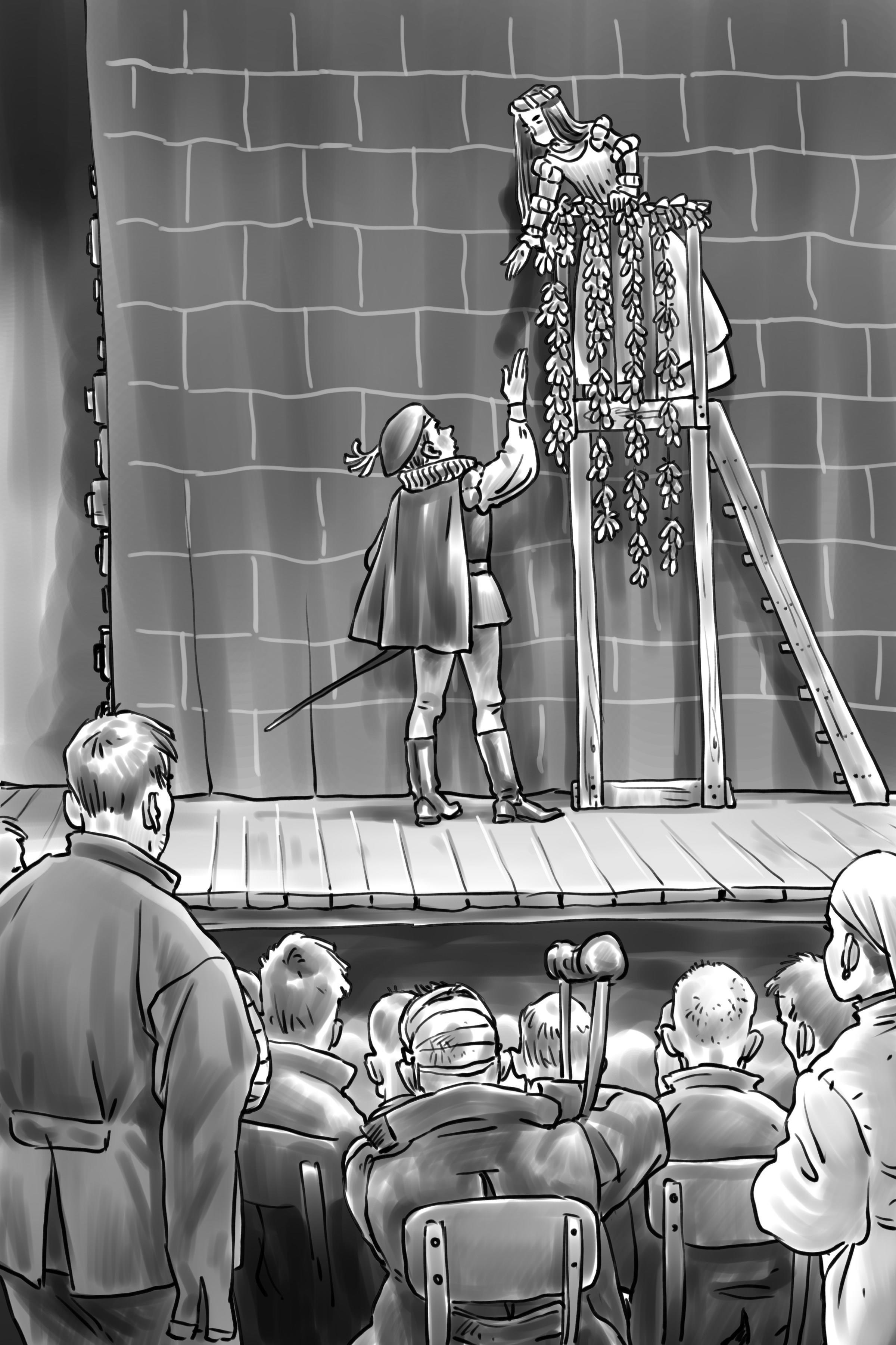 Ситцевый занавес отъехал в сторону, явив декорацию: стена с балконом, с которого смотрела вниз Джульетта-Верочка, с распущенными волосами, закутанная в пеструю шаль Натальи Максимовны, возвышалась на добрых пару метров. Магия театра превратила рисунок известкой на брезенте в старую каменную кладку. Ожили цветы из лоскутков. Раиса не могла вспомнить, кто сказал совершенно непререкаемо: “Если есть балкон - должны быть и цветы!”. «Только прикрепите получше, - смеялся кто-то нынешним утром, когда проверяли декорации, - если ваша Джульетта на Ромео эту герань уронит, она же его зашибет ненароком!»