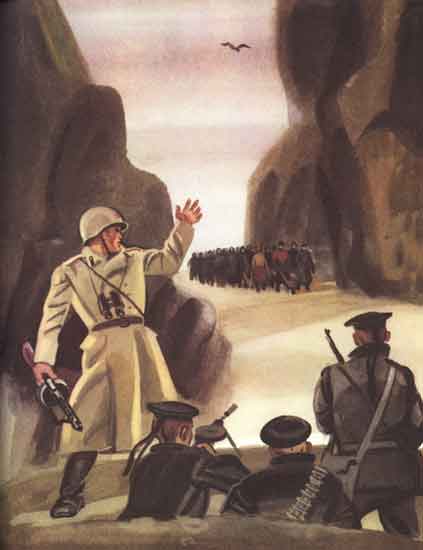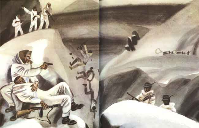 Наступает ночь. Бой продолжается в темноте. Грохочут обвалы разбуженные выстрелами горы сбрасывают со своих склонов лавины камней, снега, льда.