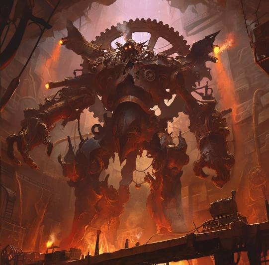 Как и остальные создания здесь, он изготовлен из металла, приводимый в движение особыми двигателями мехалитов. Голем имеет человекоподобное строение с двумя руками и ногами, возвышаясь над моей головой. У него тоже есть голова с двумя светящимися линзами, а также странные прибамбасы в виде дула раскаленных пушек. Надеюсь, что это не пушки. За спиной у монстра огромное зубчатое колесо, которое сначала показалось мне чисто декоративным, но теперь я замечаю, что оно изредка двигается на один зубец, словно отражает работу механизма в груди голема.