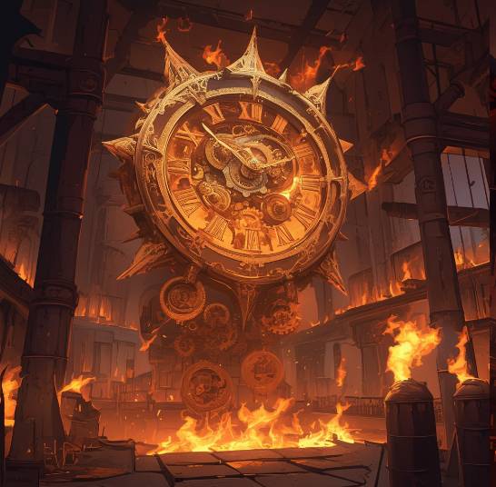 Я попадаю во многоуровневый цех, где опять резко торможу, так как впереди в воздухе висят пылающие часы. Я слишком близко к часовому механизму, чье тиканье становится еще громче.