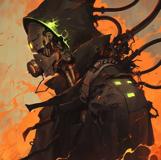 На нем плащ и капюшон, хотя не кажется, что мехалитам нужна одежда, но они скорее всего продолжают её носить в память о биологической жизни.