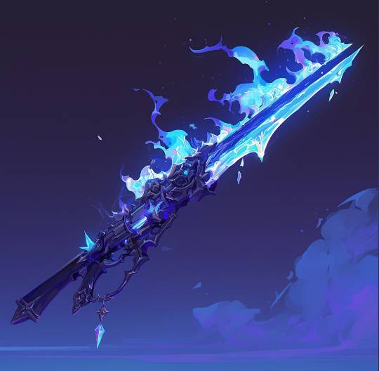 Передо мной парит несомненно оружие, которое как будто стало симбиозом винтовки и меча. Кажется, такое можно назвать ганблейдом. Темная рукоять идет к спусковому крючку, соединяясь со ствольной коробкой, на которую насажено пылающее ледяное лезвие, как будто пиромантия объединилась с психическим льдом. При этом лезвий на самом деле два. Смотрящее в пол более широкое, потом происходит раздел, который позволит производить стрельбу из ружья, а сверху более тонкое лезвие, кажущееся слишком хрупким, как хрупкий лед под лучами весеннего солнца.