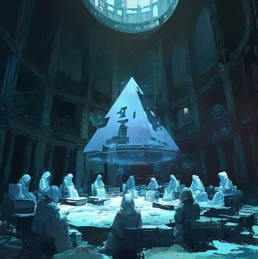 Верхушка мехалитов тоже носит белоснежные одеяния, заседая в кругу под призрачным светом ламп, имитирующих пасмурный день на прозрачном куполе наверху. Фигуры в капюшонах сидят молча, а перед ними в воздухе медленно вращается голограмма пирамиды. Вероятно, это отображение административного здания, но я не знаю, почему некоторые участки как будто пропали. Возможно, так показываются повреждения, нанесенные Фракцией Глубин.