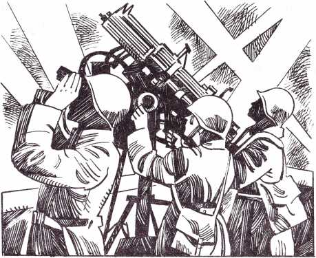 И сотни желтых звездочек запрыгали в небе. Это ударила зенитная артиллерия. Высоко вверх бьют зенитные пушки.
